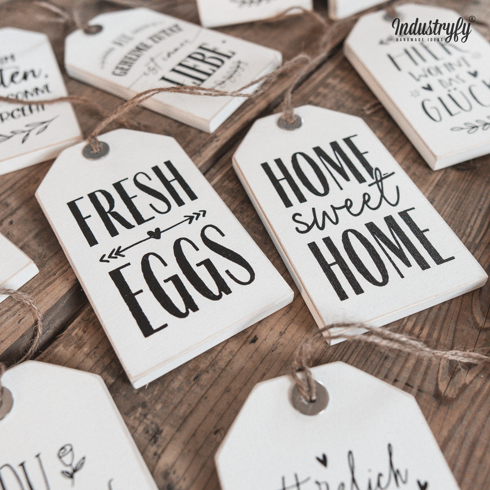 Das Farmhouse Hangtag besteht aus 9 mm starkem Birken-Multiplex. Die Oberfläche wird mit Acrylfarbe gestrichen und die Kanten von Hand abgeschliffen – für einen authentischen Vintage-Look.